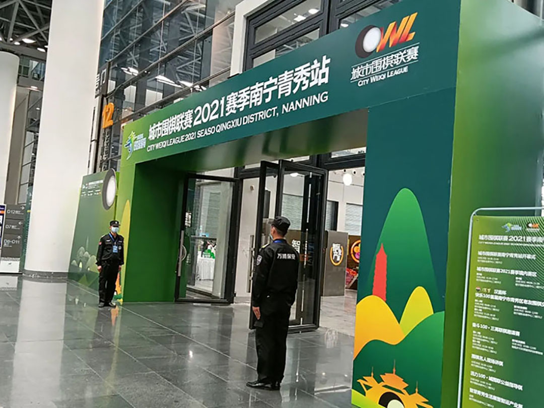 10月29日城市围棋联赛2021赛季南宁青秀站,在南宁国际会展中心开幕隆重开幕,广西万腾保安公司作为连续5年,城市围棋联赛官方合作安保机构,顺利完成了此次开幕的安保秩序维护。城市围棋联赛青秀站赛事,是南宁市青秀区创意生活节的重要活动之一,全力助推南宁青秀区创建“全国围棋之乡”。我们严格把关出入口安全,时刻保持现场秩序的稳定,开展进出人员安全检查,防止安全隐患的发生,增强重点区域的巡逻防守,全力营造平安祥和比赛氛围,棋手们专注着围棋比赛,保安员们专注着秩序维护。