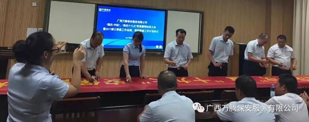 在全区上下满怀豪情迎接党的十九大胜利召开之际,广西万腾保安公司以此为契机,积极备战,主动作为,9月28日,在目标单位举行“国庆·中秋”暨“党的十九大”安保誓师大会,集团公司领导、业务部门领导和公司在管项目班长以上管理层共40多人参加了誓师大会和签名活动。