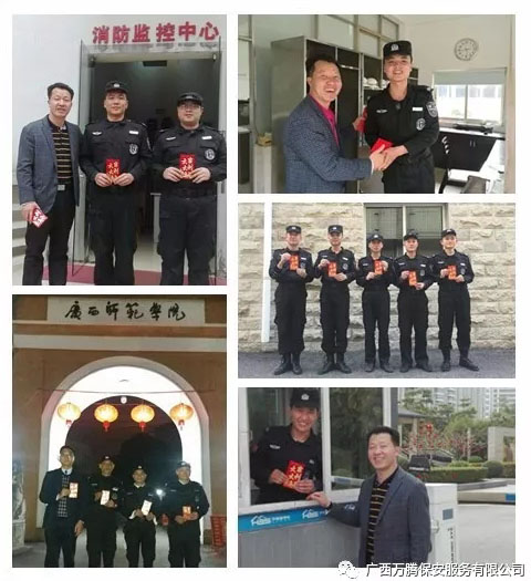 节日期间员工的稳定,与公司平时的人文关怀及节日期间的关爱息息相关。为确保客户的安全利益和项目节日期间的人员稳定,公司采取内外结合等多种形式,想员工所想,主动作为、主动汇报,在年前就将各项目员工的年夜饭团拜费、过节加菜费、加班费、过节补助费、初一项目慰问红包等17万多元如数作好预算,并及时派发到项目和员工手上。各客户单位也把保安队员当作自己的员工对待爱护,电视台周台长、办公室钟主任、莫副主任等领导舍弃与家人团聚的机会,组织保安队员和剧组人员一起聚餐过除夕夜,台新闻频道也给项目赠送了30件饮料;广电网络总经理黄海山除夕夜带上水果、糖饼看望、慰问坚守岗位的保安队员,主管后勤部门也于年前提前为保安队员准备了5000元的春节慰问金;南宁监狱项目也为队员申请了近10000元的值班补助费和除夕、初一、初二加餐、水果、饼干等慰问品,邀请队员参加本单位的干部职工游园活动;金融集团南宁分公司项目在年前也给队员派发了水果和糖饼等慰问品。各项目也充分利用值班、夜查等各种机会开展思想教育和谈心工作,对临时有困难不能按时上班的队员,骨干主动替班值班等关爱行动,较好地营造了温馨和谐的大家庭氛围。以上种种关怀,显现了合作双方坚持以人为本,关心关爱队员的大爱格局,有力确保了队伍的稳定,凝聚了力量,激发了队员站好岗、执好勤、护好门的责任和以项目为家、干好工作的热情。