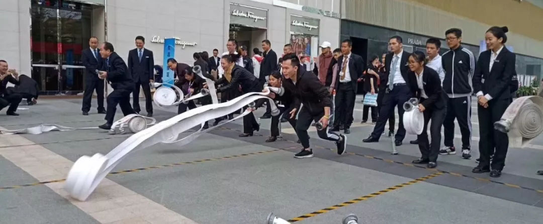 8时30分,演练正式开始。演练模拟了万象城某楼层店铺因违规动火作业,引燃周边易燃物品,火势迅速蔓延并失去控制的场景。在消防主机有火警信息反馈时,消防监控值班员30秒内通知就近岗位现场查看火警,确认情况后,监控中心立即启动初期火灾应急预案;租户及员工听到消防广播、警铃响起后,在工作人员的引领下,立即通过就近消防楼梯和通道进行疏散逃生,到达指定地点集合。5分钟内消防官兵到场支援,消防高喷车高高举起,水龙喷涌而出射向火场,成功将火扑灭。紧张有序的疏散演练结束后,现场观摩人员还参与了消防水带使用操作及正确使用干粉灭火器灭火的实操活动。